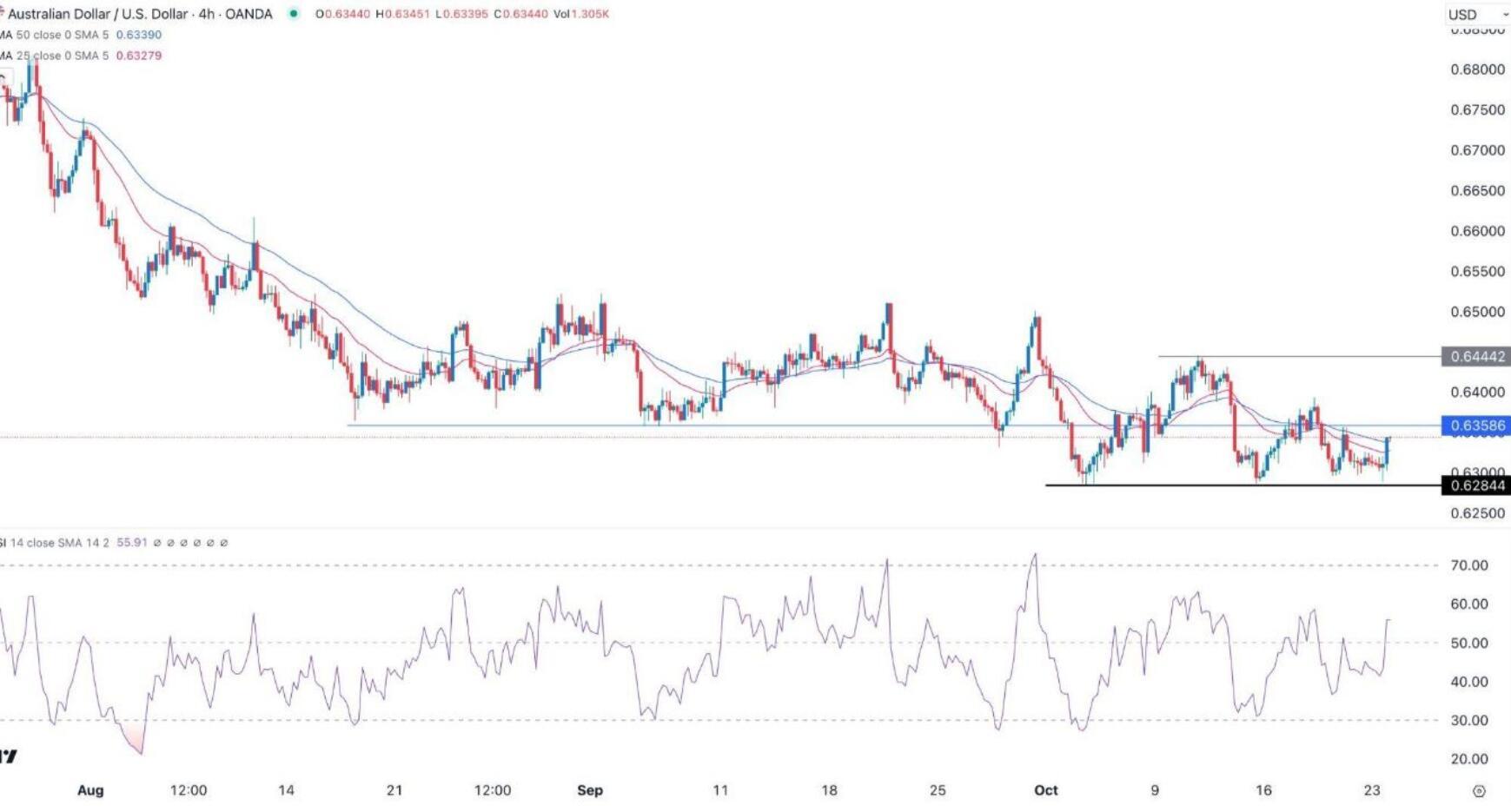 澳元兑美元货币对交易的技术分析4小时图显示,澳元兑美元在触及关键支撑位0.6284后反弹。这是一个值得注意的价格,因为它是 10 月 2 日和 16 日的最低波动。结果,形成了三重底形态。