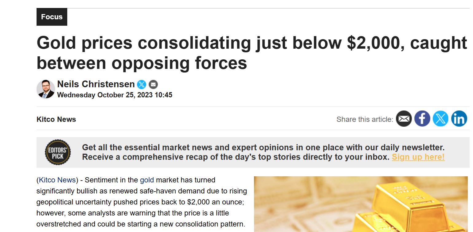 kitco分析师Neils Christensen针对近期黄金走势撰写题为《金价盘整略低于2000美元,夹在对立力量之间》文章,深入分析黄金走势。