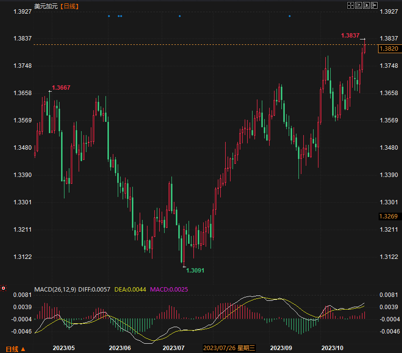 截至发稿,美元/加元汇率为1,38111,涨幅为0.14%,直冲七个月高点。