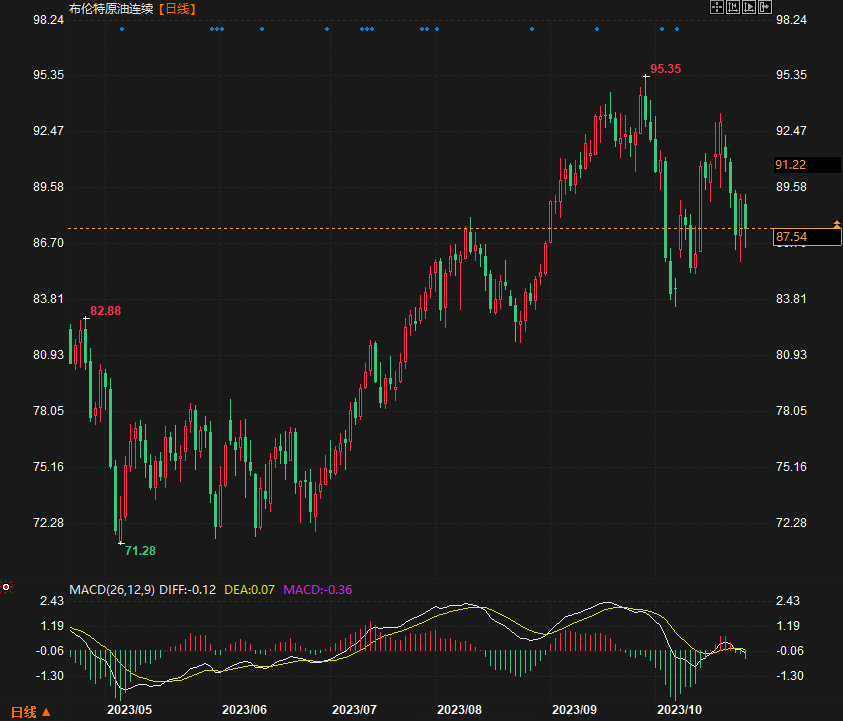 布伦特原油期货下跌2美元/桶,跌幅2.25%,至87.12美元/桶。