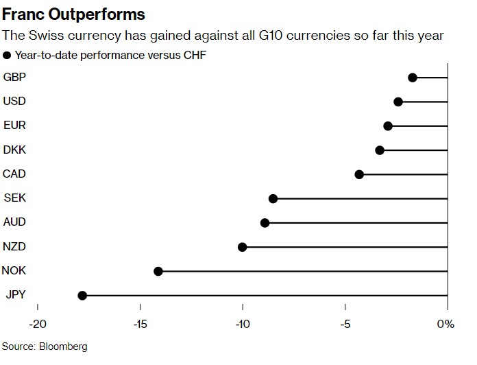 瑞郎今年表现出色——今年以来,瑞郎兑十国集团(G10)货币均有所升值