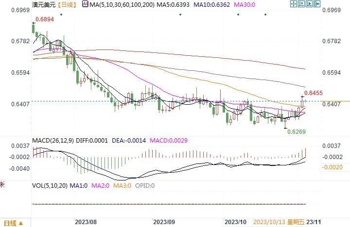 周四(11月2日),澳元兑美元攀升0.5%至三周高点0.6426,延续周三0.9%的反弹涨幅,并渐渐远离上月低点0.6271。周三美联储维持利率稳定,措辞的谨慎程度,刚好足以强化联储政策紧缩已经结束的押注。利率期货市场暗示联储不再加息的可能性约为70%,明年6月开始降息的可能性也在70%左右。相形之下,澳洲市场最近转而认为澳洲央行在11月7日会议上加息的可能性为65%。事实上,利率期货暗示隔夜拆款利率有可能从目前的4.1%上调两次至4.60%,并在整个2024年保持不变。在两国利率前景发生地位置换的预期氛围下,澳元近期获得的抬捧力量似乎有所增强。日线图上,澳元/美元已明确突破55日移动均线0.6394,为8月1日以来首次突破该均线。如果突破关键阻力位0.6509,即7月至10月跌势的38.2%费波纳奇回档位,将确认中期底部已经筑就,后市澳元/美元将有望继续上涨。短线小时图上,则存在超买调整的风险,下方关键看0.6400-0.6390区域是否撑持得住。若能保持在上述撑持水平之上,经调整过后的澳元/美元仍有望继续向高处呈反弹上行趋势。