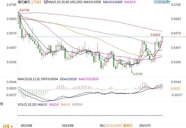 上周五(11月17日),由于美元指数连续下挫,澳元/美元也是受提携当日上涨0.5%,收盘于0.6508水平。尽管上周澳洲公布的薪资和就业数据强劲,但市场目前认为澳洲央行在本轮周期内已完成紧缩的可能性已升至70%。然而对于明年将会出现宽松的预期概率倒不是很高。相比照之下,市场预期美联储将在2024年降息概率在升高。在这点上,澳元稍许得到些安慰。此外,一系列不尽如人意的美国数据削弱风险情绪,并给大宗商品带来压力,其中石油是明显的输家。不过,铁矿石则维持在每吨130美元以上的近七个月高位附近。铁矿石是澳洲最大的出口创汇产品。为此,澳元或也从中得到些支持。从日线图上观察,澳元/美元短线在0.6520有阻力,如能上穿,澳元上升的空间有望进一步打开。下方0.6445附近的提供初步支撑。