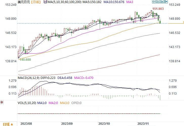 上周五(11月17日),美元继续全线大幅下跌,美元指数上周五当天下跌0.49%,一度低见103.85。美元在过去五天里的跌幅扩大至近1.8%,创7月中以来的最大周线跌幅。日元兑美元当日上涨0.69%,至149.68,近两周来首次突破150大关。美元上周遭到大幅削弱,主要是上周公布的美国通胀数据低于预期,让市场对美联储的降息预期提前。日本财务副大臣赤泽亮正周五对国会表示,日本当局在决定何时干预汇市时并没有考虑具体的汇率水平。这表明,面对前两周日元急速贬值逼近去年低点的市况,日本政府都未出手干预,显见日本政府可容忍日元贬值空间还是很有弹性的。只不过,美联储加息周期将进入拐点的预期升温,美元指数全线大幅下挫,着实间接帮了日本政府一把忙,日元兑美元自年内年的最低位置(151.92)大幅回升,极大舒缓了日元的贬值压力。在技术图形上,笔者上周曾提出观察到日线级别图上美元/日元疑似形成双顶形态。如果该形态后续能被证实成立,那么一旦美元/日元继续下跌并跌穿颈线(约莫在149.00附近),量度空间下方继续回落的目标有望奔向147-146价格区域。