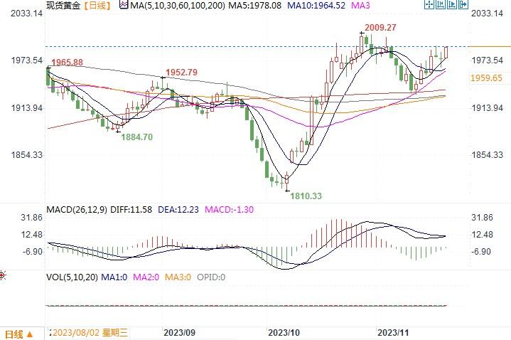 周一虽然美元因利率将有可能转为降息的预期下跌至两个月来的低点,但黄金未受到太大的抬捧。这说明市场仍在耐心地等待更多新的、积极的基本面消息来确定黄金的走势方向。周二将有美联储的10月份利率会议纪要公布,纪要内容或会揭示政策制定者第二次维持利率稳定的一些思路。市场预计这次会议纪要将为美联储的决策提供深入见解,并可能预示着美联储将转向更加鸽派的政策。这种通常被称为“美联储转向”的转变可能将促使美国国债收益率进一步走低和美元走软,从而提振金价和其他风险资产。即便如此,但金价和实际收益率之间仍存在显著差异。要突破每盎司2000美元大关,金价可能还需要显著疲软的经济数据加以支持。这从就业市场和消费者通胀报告的近期趋势中可以明显看出,这些报告重新燃起了人们对美联储比预期更早放松货币条件的希望。投资者现在关注美联储会议纪要,就是想进一步明确利率轨迹。与此同时,最大的黄金支持的ETF SPDR Gold Trust的持有量增加1.49%至883.43吨,表明在经济形势不断变化的情况下,投资者对黄金的兴趣持续存在。短期内,金价仍会对美国货币政策和经济指标的变化保持高度敏感。