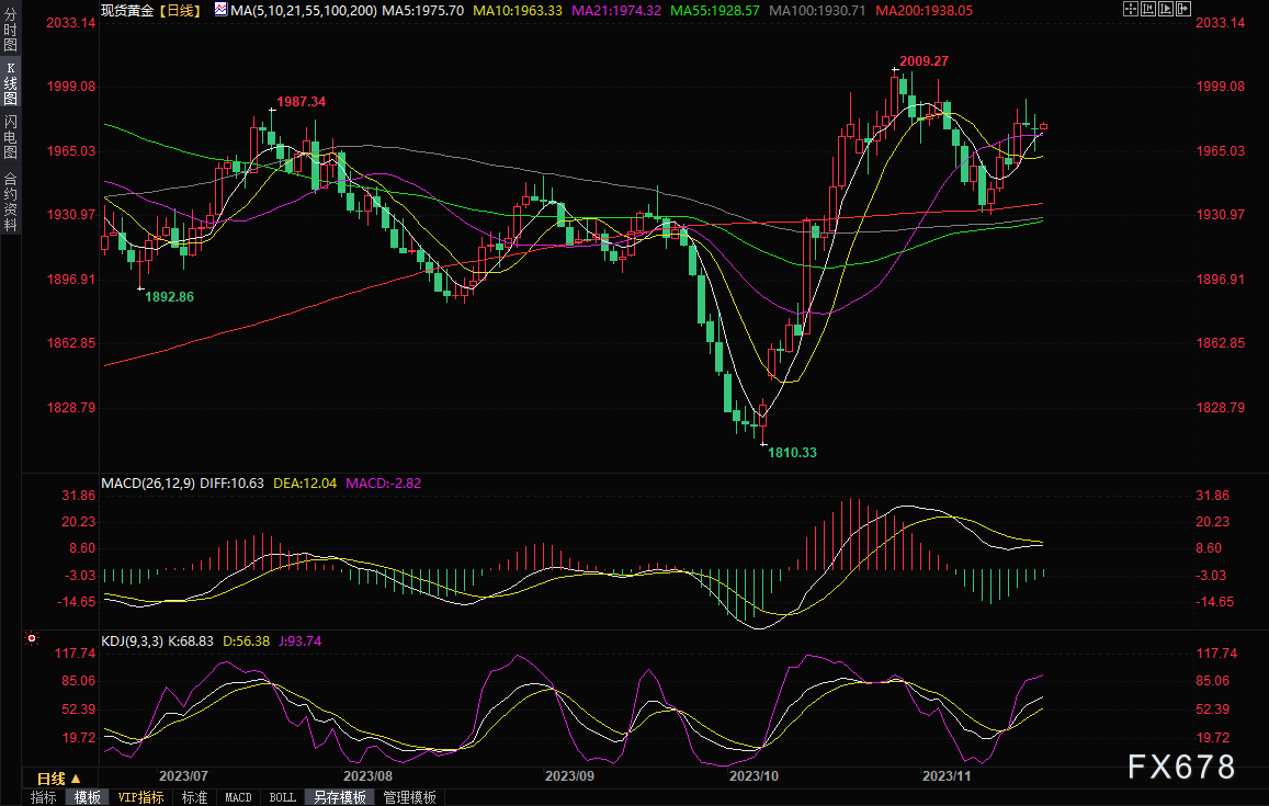 现货黄金周一收跌0.16%,收报1977.64美元/盎司。