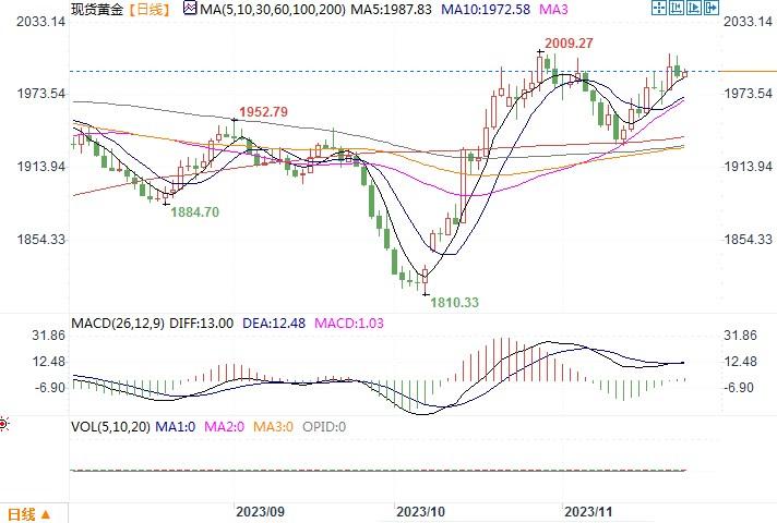 ——周三(11月22日),黄金早盘曾冲试近期强阻力2007美元,但在美国公布大幅少于预期的当周初请失业金数据后,再度回落,收盘报每盎司1,989.72美元,当日下跌0.4%。