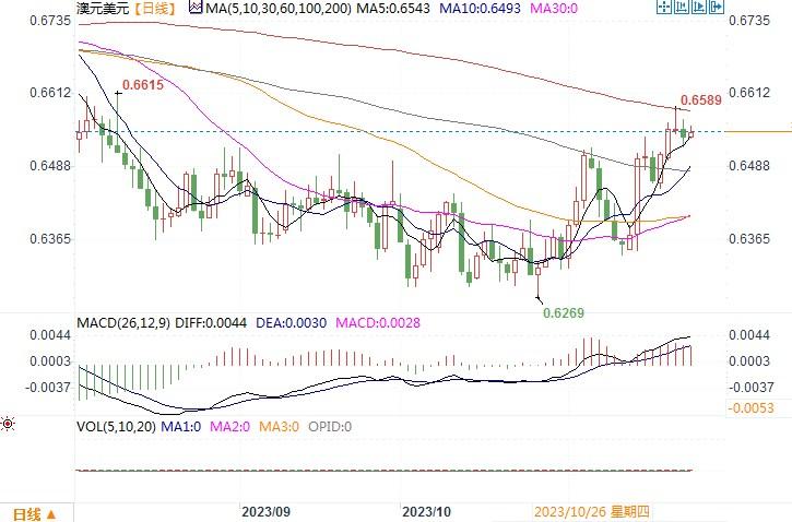 周三(11月22日),澳元兑美元变化不大,隔夜在200日移动均线0.6590美元处遭到阻滞,收盘阶段微跌收在0.6541水平附近。隔夜市场上,美元的反弹对澳元产生相应的阻滞作用。自从澳洲央行在11月的会议上将利率上调了25个基点至4.35%,而且会后的会议纪要表明澳洲央行已经做好了再次加息的准备。一时间,市场上对于澳联储将会继续加息的预期充满了期待。澳洲央行行长布洛克周二在一场小组讨论会中更是散发出鹰派信号,称未来几年通胀仍将是一个挑战。澳元/美元为此是深受一振大幅反弹走升。后续如果澳洲经济数据继续走强,将会提升澳元利率的鹰派预期。这可能会支撑澳元进一步走升。日线图上,澳元/日元仍保持在近期形成的上升通道之中,下方0.65附近构成初步的支撑。费波纳契7月至10月跌势的50%回撤位在0.6578,200日移动均线在0.6590。若能明显突破0.6600,则升势可能会加速向61.8%费波纳契回撤位0.6653逼近。
