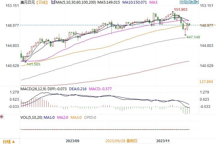 周三(11月22日),美元指数周三上涨,从两个半月低位反弹,美元兑日元当日升0.82%至149.61。美国劳工部周三表示,在截至11月18日的一周里,初请州政府失业金的人数减少2.4万人,经季节性调整后为20.9万人,为一个多月以来的最低水平(路透预测数为22.6万人)。该数据表明,劳动力市场并未像市场或美联储预期的那样迅速降温。于此同时,当天还公布了密西根大学消费者信心调查,报告显示11月美国消费者通胀预期连续第二个月上升。该报告一定程度上削弱了市场对于美国通胀率将会进一步下降的预期。受上述数据支持,美元在隔夜市场上出现反弹。前几个交易日,日元出现较大幅度回升,主因市场已经开始预期美联储最快可能在2024年5月降息,美国长期债券收益率下跌尤其明显。虽然美联储仍保持偏鹰派态度,而市场选择暂时忽略这一点。但是众所周知,美联储货币政策的变动实际上是以数据为依据的,投资者还需关注即将发布的每一个重要美国数据,以及由此导致的美债收益率走势以及美日利率差的变化。万一美债收益率触底回升,日元可能将再次承受抛售的压力。日线图上,美元/日元暂时保持在布林带中轨线之下,各类技术指标也未显现转向迹象,隔夜美元/日元的走势更大程度上像似空头回补的技术性调整。继续密切留意上方150水平的阻力情况,若继续遇阻,美元/日元仍有望继续往低点下探。
