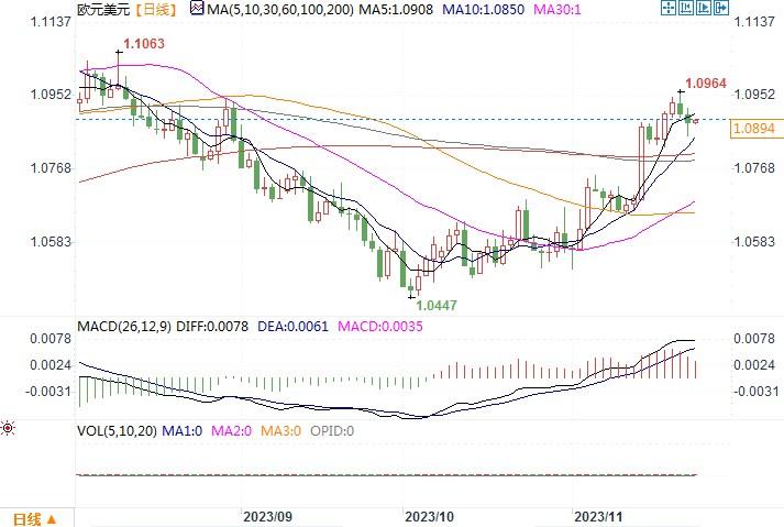 欧元兑美元日线图北京时间11月23日9:59 欧元兑美元 报 1.0894/95。
