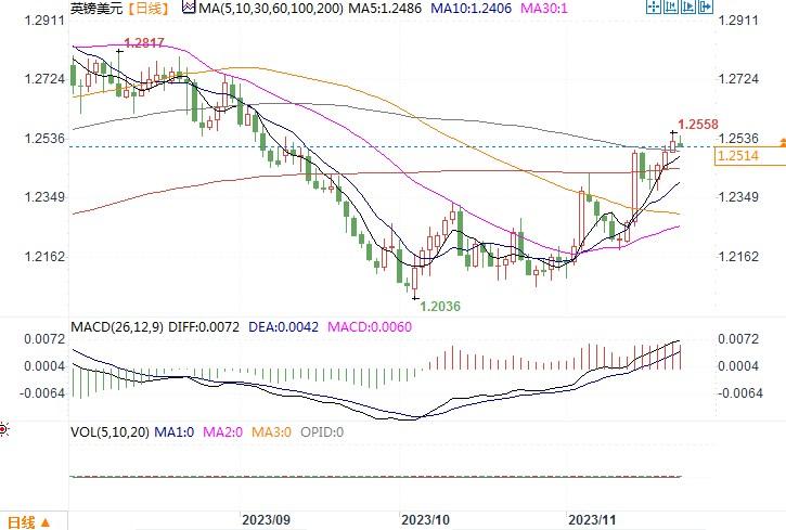 英镑对欧元、美元和其他货币走高,此前英国央行行长贝利(Andrew Bailey)和另外两名政策制定者告诉财政部特别委员会,银行利率有理由在“较长时期”暂停在5.25%,其言论还明显有打压降息押注的意味。其言论后英镑一度震荡攀升60点至1.2558,由于该水平存在日图级别的阻力位,日内稍有回落至1.2510附近,但仍处在上涨趋势中。在11月的英国货币政策报告公布后,贝利在英国国会作证,他表示,目前维持利率不变是明智的。货币政策委员会(MPC)成员Catherine Mann也在场,她警告称,更加持续通胀的前景意味着有必要收紧货币政策。