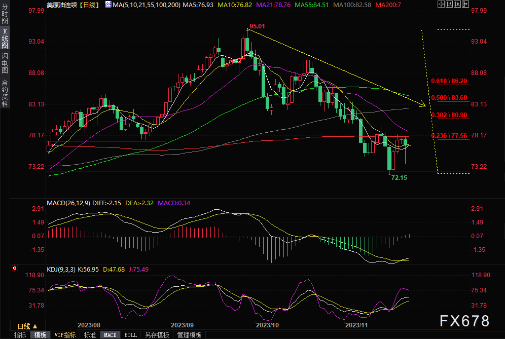 美国西德克萨斯中质原油下跌0.78美元/桶,周四收报76.32美元/桶,跌幅1%,周三曾下跌近5%。布伦特1月原油期货收跌0.54美元/桶,收报81.42美元/桶,跌幅为0.66%。