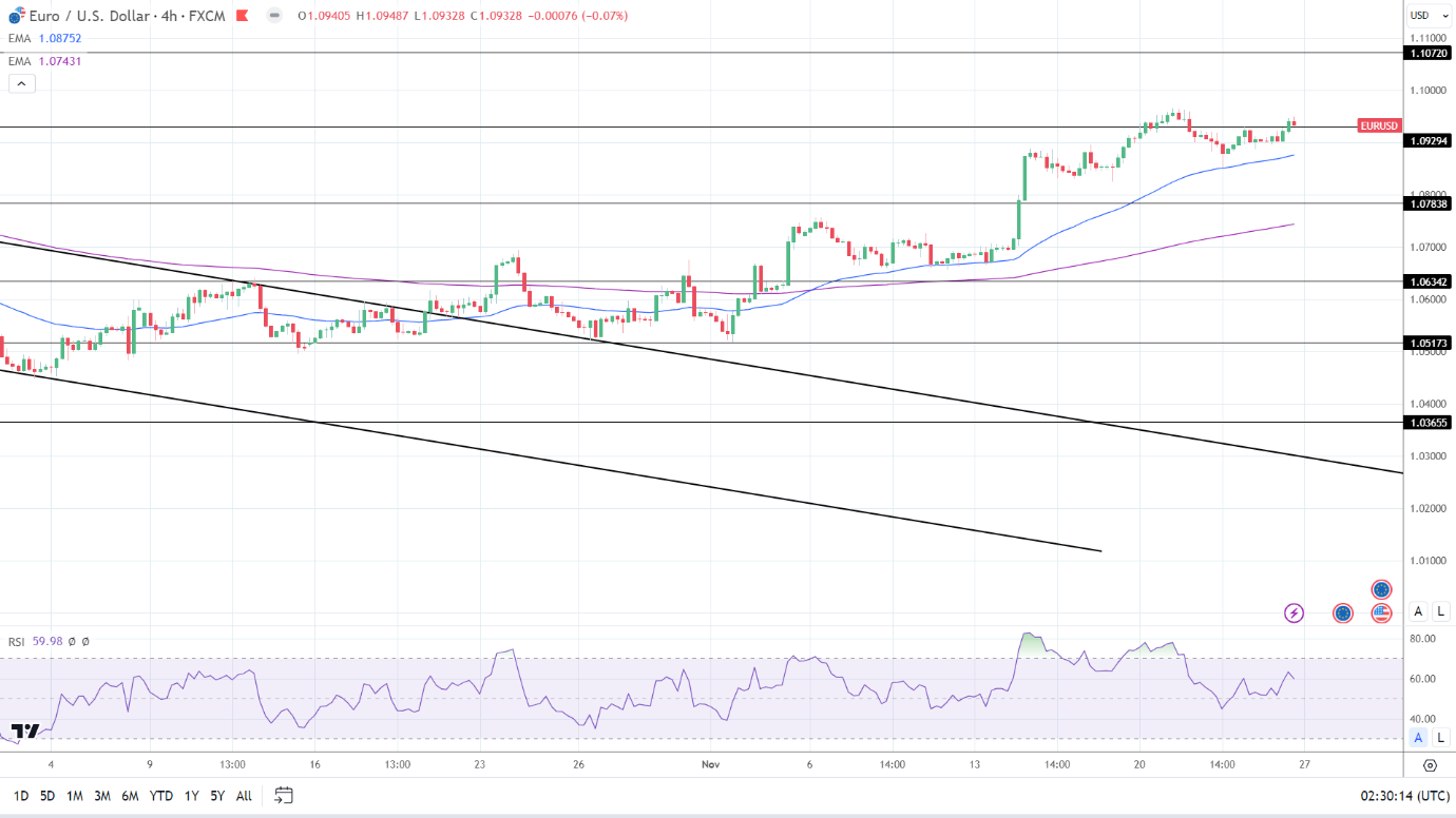 4 小时图上,欧元/美元突破上周高点 1.09652 美元将支撑其升至 1.10720 美元阻力位。