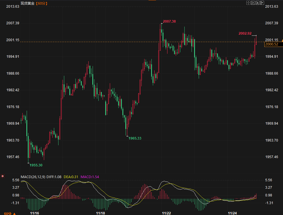 ——周五(11月24日)美市早盘,由于美元指数走弱也对金属有利,金价突破2,000美元。然而,原油价格疲软和美国国债收益率上升是限制金价上涨空间的外部市场利空因素。截至发稿,现货黄金报1999.41美元/盎司,日内涨幅0.34%。