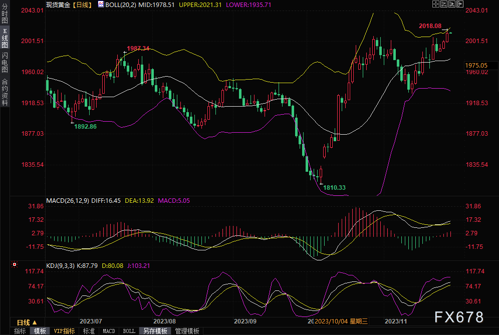 ——黄金价格周一升至逾六个月高点,因美元上升空间受挤压,投资者坚定了对美联储加息结束的押注。截至发稿,现货黄金上涨0.33%,至2009.11美元/盎司。但在当天早些时候触及5月16日的高点2017.92美元/盎司。根据计算,12月黄金期货触及2018.9美元/盎司,为10月27日以来的最高水平。