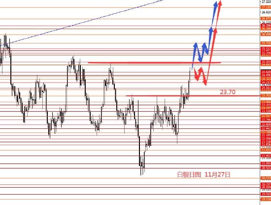 白银上周盘整后继续拉涨,马上接近25.00区域。从图形来看,后市23.70以上继续看涨,长线看涨思路不变,目标25.00和26.30和28.20区域,现在无非就是细节问题。25.00此区域有强阻力,要么在下方震荡盘整后继续拉涨,要么上破后再修整继续拉涨,所以22.90-22.60区域的多单,个人建议可继续长线持有,上周若有多单的,建议可以先离场或推保护持有。今日白银只有框架分析仅做参考吧。