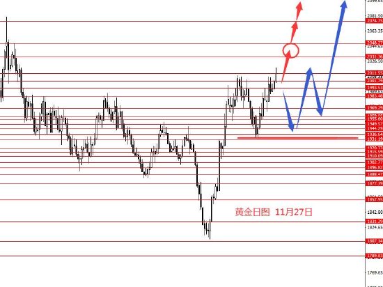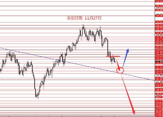 11月27日,美指上周区间震荡,周图收小阴柱。从图形来看,前期思路大框架延用即可,本周104.00以下继续看空,短线关注上周下方红圈转折点102.80和102.40区域,本周暂时只能看到这里,若下个月继续阴跌下行,则延用上周一红线节奏行情,反则得以支撑再关注备选蓝线行情。本周操作建议:103.50/103.70区域做空,止损104.20,目标看向102.80和102.40,若能成功跌破102.20再看向更低。控制仓量,严格止损。