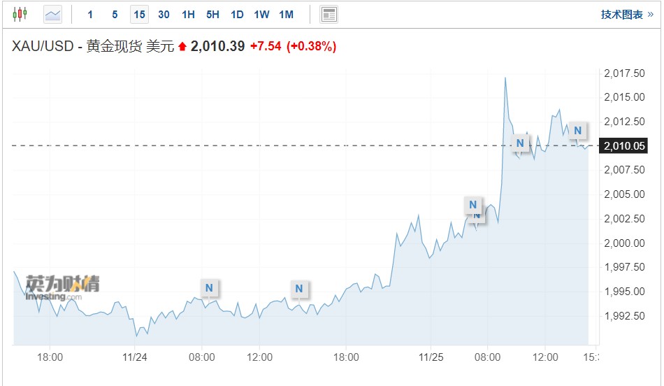 受美元走弱和押注美联储结束加息周期的支撑,同时市场焦点转向本周晚些时候公布的美国通胀数据,黄金价格周一一度攀升至6个月高点。数据显示,截至发稿,现货黄金上涨0.38%,至每盎司2010.39美元。美国黄金期货上涨0.38%,至每盎司2010.65美元。