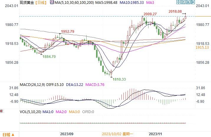 ——随着近期美国数据显示经济和通胀压力趋缓,市场已排除美联储进一步加息的可能性,对明年开始降息的预期越来越高,上周美元再度下挫,为连续二周下跌。受美元走软推动,黄金上周强劲上升,现货金价格上周大涨逾 20 美元,涨幅1.1%,收在关键的 2000 美元/盎司关口上方。