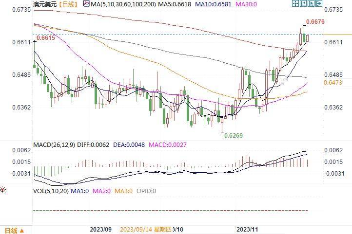 周三(11月29日),在美国公布数显示美国第三季度经济增长速度快于最初的估计,美元得到空头回补的整固,澳元/美元自高位出现一定幅度的回撤,当日下跌0.4%,收盘于0.6617。此外,当日早些时候,澳洲统计局公布数据显示,10月消费者物价指数(CPI)较上年同期上升4.9%,低于9月增幅5.6%,也低于市场预测的5.2%。备受关注的核心通胀指标--CPI结尾均值--在10月同比增长5.3%。剔除波动较大项目和假日旅游的CPI升幅放缓至5.1%,为2022年4月以来最低。澳洲10月消费者物价通胀放缓幅度超过预期,核心通胀率也有所下降,这一结果稍稍打击了央行再次加息的预期情绪。接下来关键还是要看美元的走势,如果周五美联储主席鲍威尔的讲话与美联储理事沃勒同样显露鸽派味道,澳元有望获得支撑。若鲍威尔讲话保持倾向于维持高利率,则要防范澳元/美元短线出现调整回落的风险。下方初步支撑在0.66,进而在0.6550-0.6510区域。