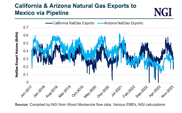 上图是NGI对加利福尼亚州天然气出口、亚利桑那州天然气出口(通过管道出口到墨西哥)的数据走势。