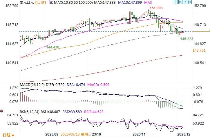 周二(12月5日),美元指数上涨0.41%,触及104.03的一周来最高。而美元兑日元虽有小幅震荡,但收盘价与周一基本持平报147.15。美国劳工部周二在职位空缺及劳动力流动调查(JOLTS)报告中称,10月最后一天,衡量劳动力需求的职位空缺减少61.7万个,至873.3万个,低于预期。美国职位空缺的减少,虽然有助于押注美元利率转降的预期,但当日对美元未产生负面影响。这主要是在关键的非农关键数据出结果之前,市场上美元继续得到来自空头回补交易的支撑。然而,近期美元利率明年即将转降的预期氛围逐渐升高,已颇使日元受益,日元走势离年内的低点渐行渐远。技术图形上,美元/日元上行空间仍然受限于横跨148.09-149.90的日线云区, 美元/日元汇价已跌落至上升云区下方,一目均衡转换线和基准线均偏空,14日相对强弱指数(RSI)仍偏空,强化了整体看跌行情。目前下方146.31提供了较强的支撑,146.31是137.25至151.92(7月至11月)涨势的38.2%回档位,若该支撑位彻底跌穿,美元/日元下行幅度有望进一步拓深。