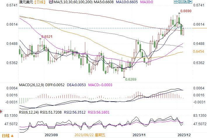 周二(12月5日),澳元兑美元下跌1.03%,报0.6545美元,远低于周一触及的四个月高位。澳洲央行周二将利率维持在4.35%的12年高位不变,对于是否需要进一步加息的问题,会上澳联储的态度显得不太坚定,澳洲央行声称未来的经济数据将决定是否需要在某个时候进一步加息,并指出经济前景上档和下档都存在很大不确定性。会议声明被市场认为偏鸽,为此市场预计澳联储再次加息的可能性下降。期货市场目前预计澳洲央行3月加息的可能性为38%,而会议之前预计约为44%。短线小时图上,澳元/美元进行着超跌空头回补的修整。日线图上,整体尚能保持在上升通道之中,但技术指标存在转向痕迹。下方0.6550-0.6500区域的支撑较为关键,若跌穿,澳元/美元将面临由升转跌的风险。
