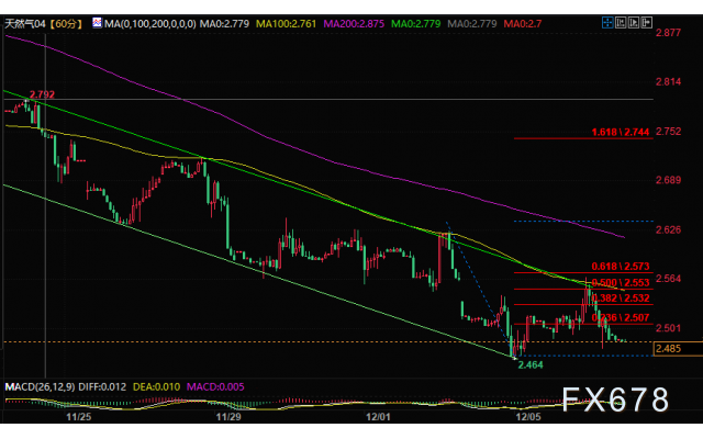 ——周三(12月6日),亚盘时段,美国天然气期货在50日均线下低位徘徊,主力合约目前交投于2.689美元/百万英热附近。在库存增加等因素的影响下,美国天然气走低的趋势明显。