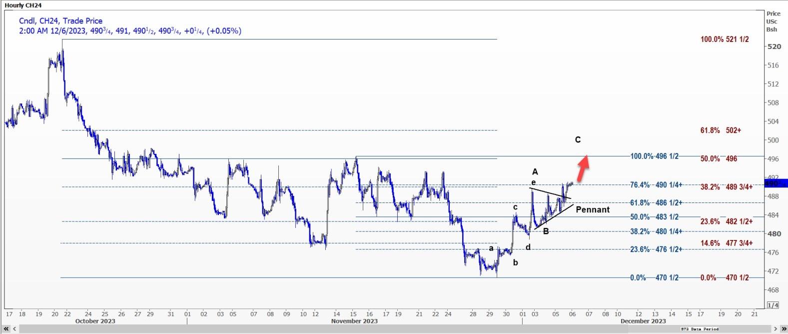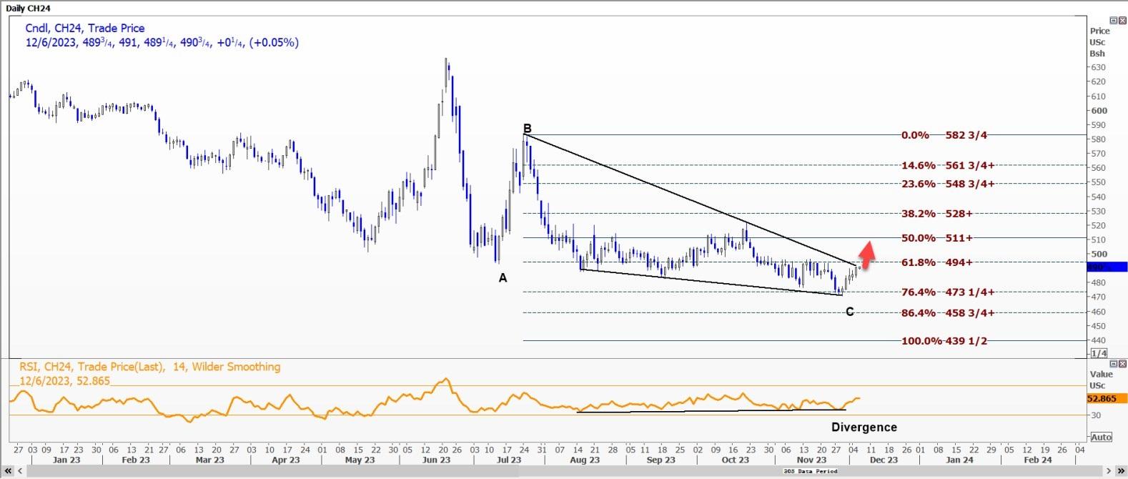 CBOT3月玉米合约CH24可能会攀升至每蒲式耳4.9650美元,该合约已经基本突破了4.9025美元的阻力位。这可能是该合约在升至4.9650美元水平前的最后阻力。