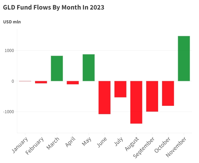 黄金的投资兴趣明显上升,根据Vettafi ETFdb.com数据,11月份约15亿美元的净资金流入全球最大黄金ETF SPDR Gold Trust(GLD)。此次资金流入不仅是2022年3月以来最大规模的一次,而且打破了连续五个月出现资金外流的局面,标志着投资者对这种贵金属的兴趣重新抬头。