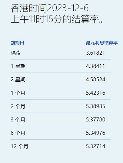 12月6日,港元拆息连续三日全线下跌,其中,隔夜息低见3.61821%,连跌七日,续创逾一个半月新低。与楼按相关的一个月拆息报5.42316%,亦见逾一周新低。反映银行资金成本的三个月拆息六连跌,今日进一步降至5.3778%,创近三周新低。六个月及一年期分别降至5.34976%及5.32714%。