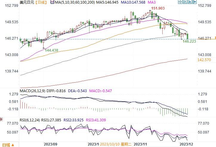 周三(12月6日),美元指数盘尾上涨0.19%,报104.16,美元兑日元也略涨0.15%,收盘在147.38。周三来自美国的经济数据显示,美国11月ADP就业人数增加10.3万人,预期增13万人。由于ADP就业数据低于预期,投资者对通货膨胀继续下降感到乐观。市场对于美联储明年将会降息的预期概率不低,但由于对诸如欧央行等其他央行的降息押注大幅提升,美元暂时得以持稳。如果周五美国非农就业数据也同样显示增长低于预期,势必引燃降息预期提升。周三当天,日本央行副行长Ryozo Himino的讲话“鸽中带鹰”,尽管重申了继续实施货币宽松的标准承诺,但却暗示负利率政策将结束。其讲话虽未对日元形成明显的影响,但他的这番言论是日本央行领导层迄今为止最明确的信号,表明当局正在考虑如果结束负利率将会产生什么影响。这些观点可能会强化日本央行观察人士的预期,即该行将在2024年中结束负利率。美日两国央行利率在预期上的分化,对货币有利的砝码或将渐渐偏向于日元。日线图上,美元/日元继续呈窄幅盘整的走势,这种走势格局恐要等到本周五美国非农数据揭晓后方有望打破。