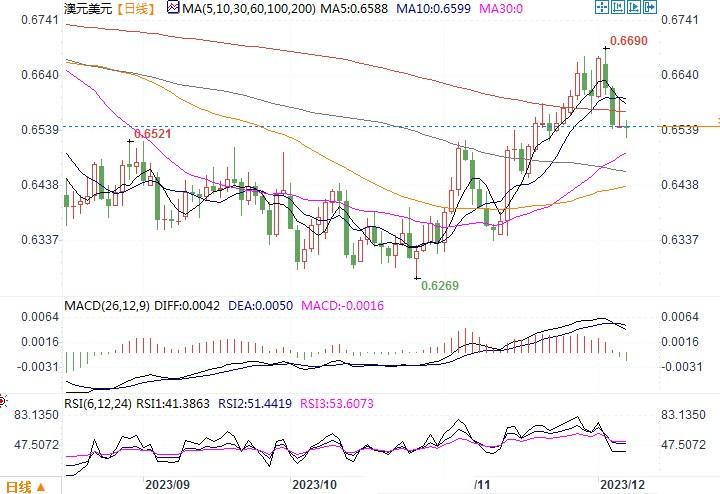周三(12月6日),澳元兑美元继续微跌0.02%,收盘于0.6549。澳洲央行周二维持利率在4.35%不变,并对再次加息释放偏鸽态度。这对澳元造成打击。市场则因此降低了进一步加息的可能性。这种态度转变在隔夜急剧升温,当时欧洲央行一位高官为提前降息敞开大门,而美国一份就业报告也意外疲软。投资者认为,如果其他主要央行明年都在放松政策,那么澳洲央行很难在明年加息,因此将该央行再度加息的可能性从44%降至仅有10%。而且周三数据显示,由于借贷成本上升和消费降温,澳洲第三季经济仅增长0.2%,支撑了鸽派前景。日线图上,平滑异同移动平均线(MACD)形成死叉,显示澳元/美元短线有走弱趋向。目前下方0.6550-0.6500区域的支撑较为关键,若下穿,11月份以来形成的上升通道可能将发生逆转。
