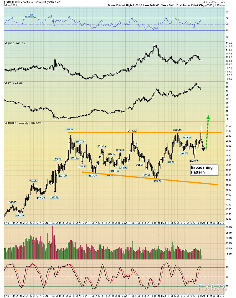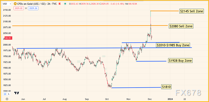 汤姆森表示,周一(12月4日)黄金价格疯狂走势是教科书级别的喇叭口形态。技术指标上,随机指数显示交叉卖出信号,RSI指标却没有发出该信号。金价可能在一到两周的徘徊期后迎来另一轮更重要的反弹,重新站上2080美元/盎司关口。此前在2080美元/盎司获利了结的投资者现在可以考虑在2010美元/盎司、1985美元/盎司和1928美元/盎司买入,但跌到1928的可能性比较低。