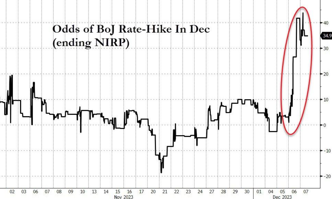 几周前日元兑美元汇率低至152,极端投资者还十分确信日本央行在2024年年中之前不会采取任何行动,但现在他们却认为日本央行将在12月19日的会议上结束负利率政策的几率为37%,隔夜这一几率甚至一度高达45%,这刺激日元隔夜盘中暴涨约4%。日本国债也出现了大幅抛售,10年期日本国债收益率隔夜上涨了11.5个基点,而在30年期日本国债拍卖需求疲软、出价比为2015年以来最低之后,日本债券抛售加剧。