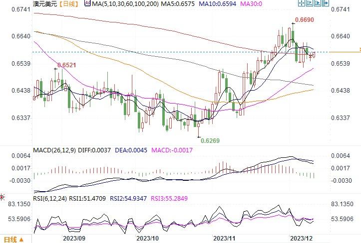 周一(12月11日),澳元兑美元下跌0.17%, 收盘在0.6566。周末的数据显示,中国11月CPI同比创三年来最大单月降幅,该数据导致人民币走低,通常作为人民币流动性替代对象的澳元也伴随着下滑。本周重要事件不少,周二美国公布消费者价格指数(CPI),随后美联储、欧洲央行和英国央行宣布利率决议。尤其是美联储会议尤为关键,如果会议维持利率不变,且美联储主席鲍威尔对于美元利率走向没有发表太过于鹰派的言论,那么澳元有望走升。而一旦鲍威尔就美联储明年是否降息问题持鹰派态度,澳元将会受压。从日线图上观察,布林带区间收缩,信号显示无强烈走势倾向。如果收盘价低于已测试过的低位0.6529,即10月/12月升幅的38.2%回档位,则将看跌。