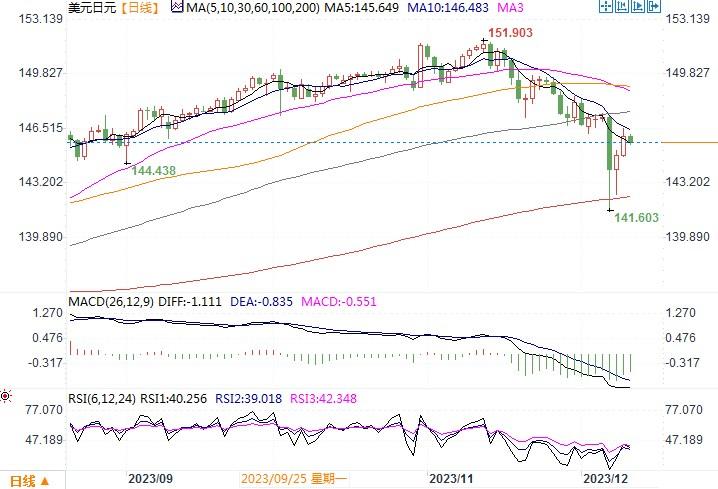 周一(12月11),美元兑日元一度高见146.58,盘尾收报146.14,当天上涨0.85%。日元兑美元几乎回吐了上周四的大部分涨幅。日元上周四急升,主要是此前日本央行总裁植田和男表示,一旦短期借贷成本离开负值区域,央行在利率目标设定上将有多个选项。不过,彭博新闻周一援引知情人士报导称,日本央行官员尚未看到证据表明工资增长力道足以合理化在本月结束超宽松货币政策。而且植田上周的话实际上并没有具体表明他们将结束负利率政策。随着结束负利率预期高温的消退,叠加美元因非农强劲回升的影响,美元/日元在空头回补力量推动下不断缩减来自上周的跌幅。接下来,交易员的目光将投向周二美国的消费者物价通胀数据以及周三召开的利率会议。纽约联储周一公布的一项调查显示,随着预计汽油和租金成本涨势将放缓,11月美国消费者的一年通胀预期降至逾两年来最低水平。而且市场预期本月的利率会议,美联储仍会按兵不动。若最终结果如上述预期一致,那么美元/日元的回升脚步估计要停歇下来。从小时图上观察,美元/日元在146.40附近遇阻,出现超买调整的走势姿态。日线图上,美元/日元仍处在下降通道内,下方145.00的支撑位较为关键,若跌穿,美元/日元将继续行进在下降通道中。而上方一旦突破147.50-148.00区域,美元/日元整体走势有可能会发生根本性的方向转变。