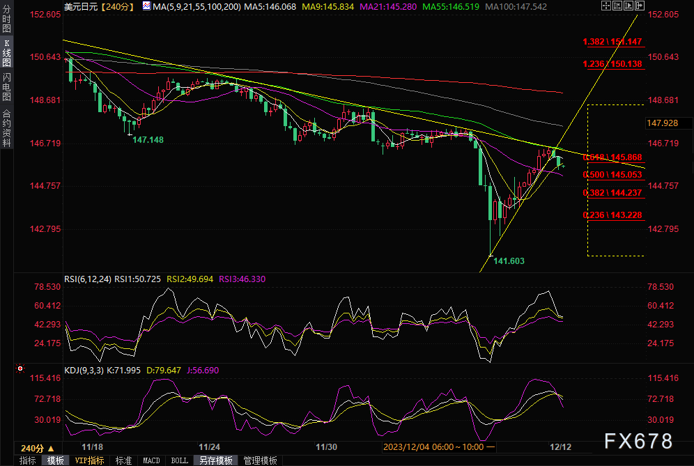 ——周二(12月12日),亚盘时段,美元/日元震荡下跌,盘中最低触及145.53,跌幅约0.42%,目前交投于145.72附近。美元/日元再次测试自11月中旬以来形成的下跌趋势线后转跌,后市可能会再度下探近期低点141.60附近支撑。