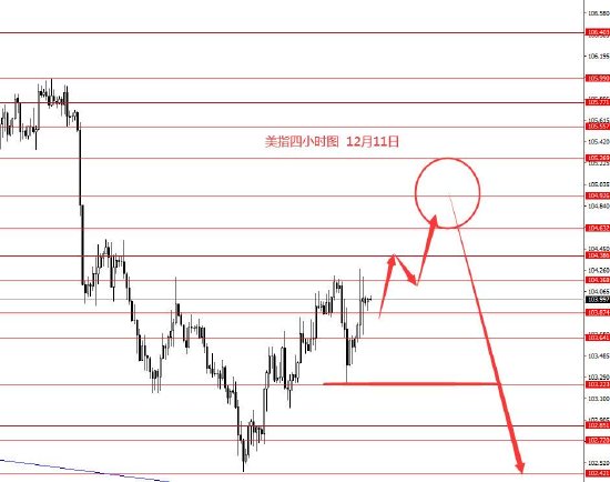 12月11日,美指上周正如预期小幅震荡向上反弹,本周继续延用上周一框架思路,周初关注下方103.20强支撑,以上继续小幅向上反弹的概率较大些,但具体能反弹到多高,目前不确定,上方关注104.60和104.90,反弹极限105.30区域,反弹后若能在104.90至105.30区域给出向下信号,再去中长线放空。今天只有大概思路,没有具体操作建议。
