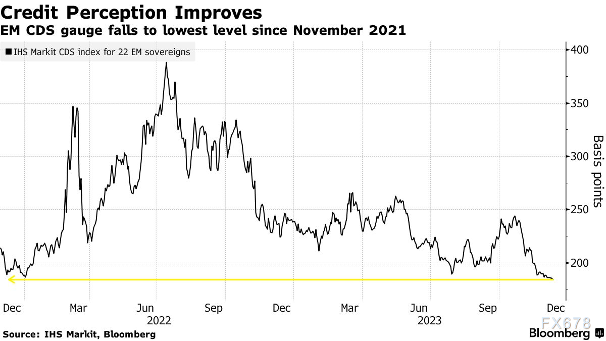 IHS Markit数据显示,涵盖22个政府借款人的信用违约掉期指标收窄,使得利差缩小到185个基点。