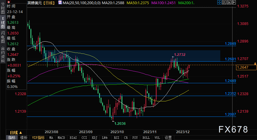 美联储承认可能在2024年降息75个基点之后,英镑兑美元强势反弹,站上20均线1.2588。这在很大程度上得益于美联储的鸽派程度超出预期,美元在随后出现巨大的抛售。目前市场对美联储明年的降息幅度有所增加,美联储掉期交易的价格显示降息幅度可能高达140个基点。