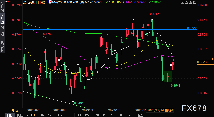 若突破100日均线阻力,下一阻力位置在200均线0.8661附近。进一步强阻力在11月23日高点0.8720附近,对英镑多头来说,这可能是一个棘手的难题。