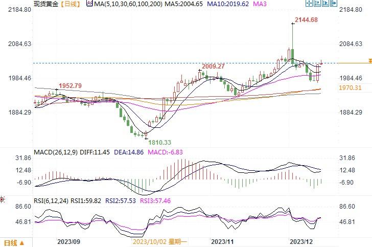 ——周三(12月13日),由于美联储利率会议第三次维持利率不变此,且暗示加息周期结束并表示明年可能降息。现货金上涨2.43%,高收盘在2027.81美元/盎司,全日金价飙升近50美元。