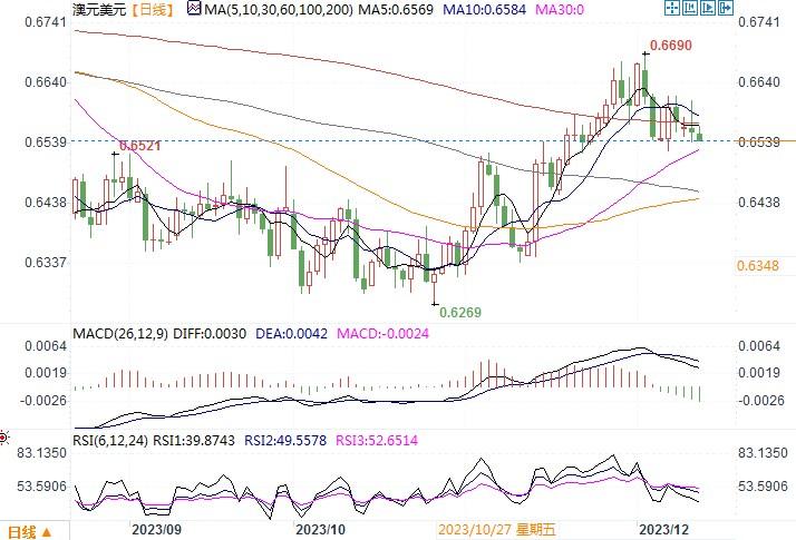周二(12月12日),澳元兑美元继续小幅震荡,收盘在0.6559水平。由于铁矿石价格走高,亚洲市场风险情绪好转,曾在亚洲交易时段给到澳元抬捧。然而周二公布的一项调查显示,澳洲12月消费者信心略有回升,但全年表现为有记录以来第二差,因为生活成本飙升且利率大幅提高。另一项调查显示,由于销售和利润疲软,11月份澳洲企业信心下滑,同时由于闲置产能不足,价格压力有所上升。澳洲央行总裁布洛克表示,政策制定者对货币政策正在采取谨慎的态度,并将继续关注新的数据,同时补充说,澳洲在全球通胀斗争中并没有落后。近期的经济表现似乎在渐渐降低认为澳联储尚有一次加息的可能性。为此,澳元/美元在12月初触及年内高点0.6690后处在连续回落的态势之中。日线图上,澳元/美元仍顽强守在0.6520水平之上,但技术指标有倾向下摆迹象。日内需留意美联储12月份利率会议结果以及对未来利率路径的态度。若美联储表态偏鹰,澳元/美元恐怕会继续下滑。
