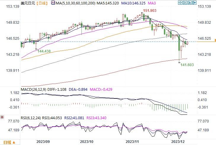 周二(12月12),美元兑日元下跌0.40%,收盘于145.60,盘中最低一度跌至144.75。周二美国公布11月份消费者物价指数(CPI)显示,美国11月末季调CPI同比上升3.1%,创六个月以来新低;季调后CPI环比上升0.1%,与预期及前值均为持平。11月份通胀数据虽然意外上涨,但低于前值。数据给市场的感觉是已经看到抗通胀方面取得了足够的进展,美联储下一步将是降息,但目前真正的问题是时机,这些数据表明,在美联储能够放心地降息之前,仍需要看到一些核心指标表明进一步进展。接下来,美联储将于周三结束为期两天的会议,届时投资者将重点关注决策者如何看待经济的情况,以及他们对未来几个季度利率路径的看法。交易员们还将关注美联储主席鲍威尔是否会淡化2024年上半年降息的前景。隔夜外汇市场上,因通胀数据平平,美债收益率有所下跌,促动美元/日元的下跌。此前,彭博新闻周一报导称,日本央行官员认为没有必要操之过急,他们还没有看到足够的薪资增长证据来证明通胀将持续下去。这打碎了最快可能下周结束负利率的希望,日元有所回软。目前交易员聚焦周四凌晨美联储利率决议以及鲍威尔的讲话。如果美联储维持利率不变,且鲍威尔在货币政策上的发言没有出现太过鹰派的态度,则美元/日元将会继续走低。若鲍威尔表露希望维持高利率水平更长时间,甚至不排除必要时再加息的态度,那么美元/日元会继续出现空头回补的修复行情。