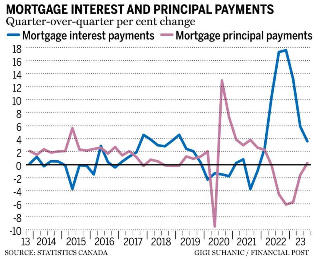 自加拿大央行开始加息以来,加拿大人在抵押贷款上支付的利息增加,用于本金的金额减少。但是,与第二季度的5.9%相比,第三季度利息支付的增长放缓至3.6%,本金支付连续五个季度下降后增加了0.2%,统计局表示。