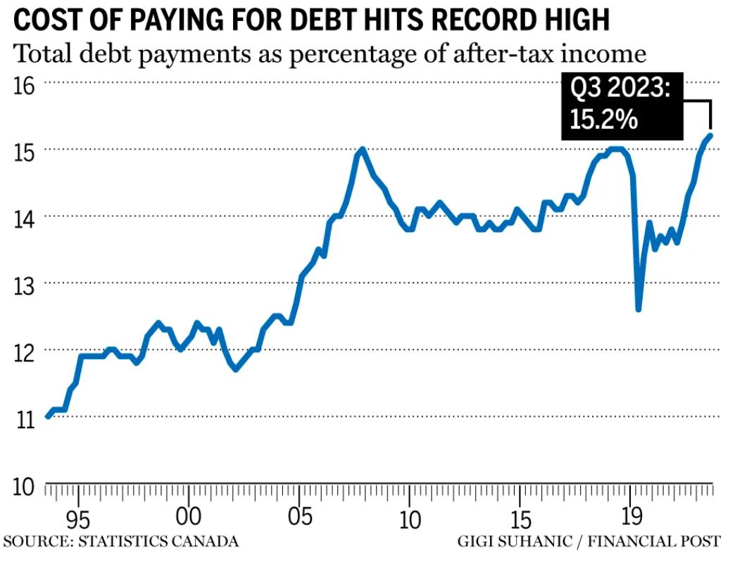 在2023年第三季度,为支付债务成本而支付的金额达到了历史新高,加拿大统计局表示,家庭债务服务比率从第二季度的15.1%上升到15.2%。