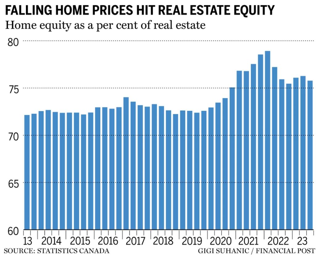 加拿大皇家银行的经济学家凯莉·弗里斯通 (Carrie Freestone )表示,房屋价格在2022年第二季度达到峰值后,房屋净值现在低于10%。然而,与2019年第四季度(疫情爆发前)相比,仍然高出57%。