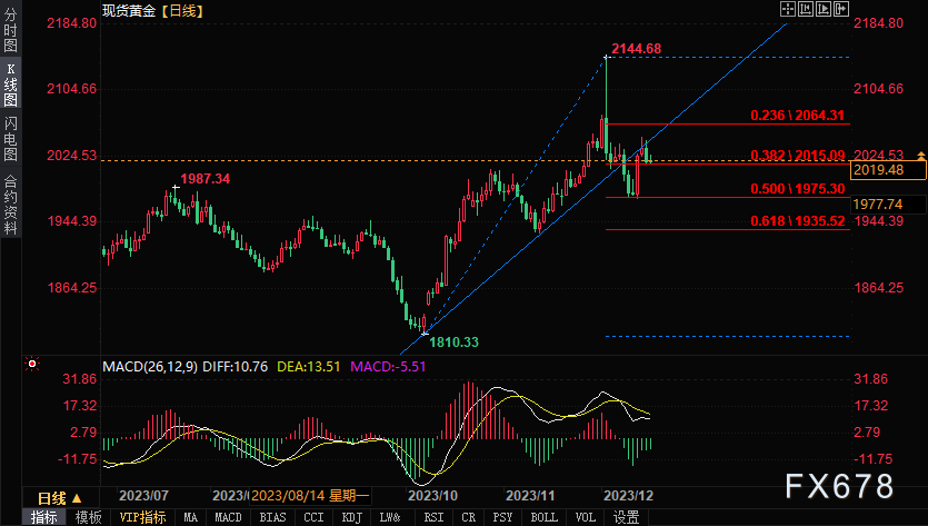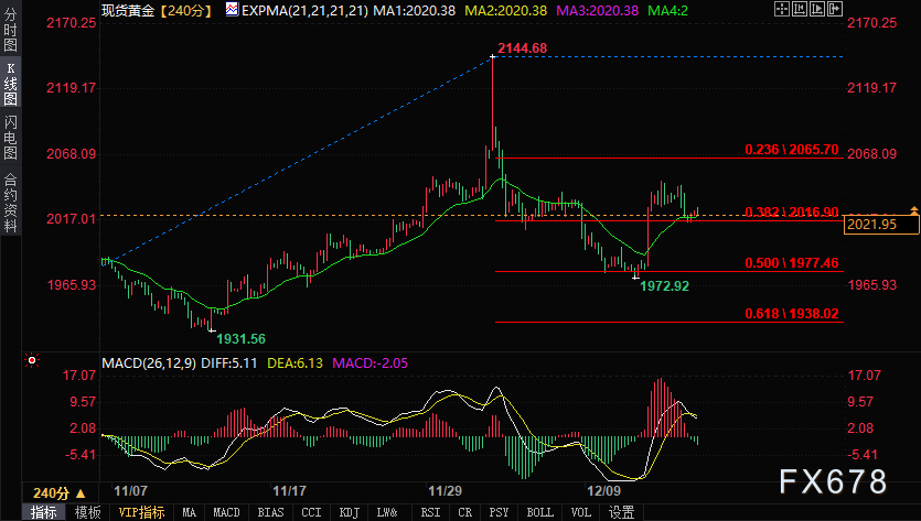 周一(12月18日),欧盘时段,现货黄金窄幅波动,现报2019.20,涨幅0.04%。