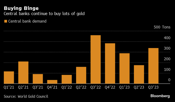 今年各国央行大幅增加了黄金储备,据世界黄金协会(WGC)称,继第二季累计购买175吨之后,各国在2023年第三季购买337吨,这一数量超出了最初估计的103吨。